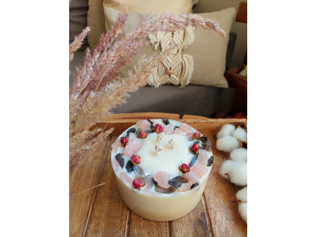 Svíčku zapalujte šetrně, ideálně tak, aby vosk tál pomalu a zůstal pevný okraj i dekorace. Nechejte hořte maximálně 2 hodiny v kuse, aby kameny zůstaly stabilně usazené.