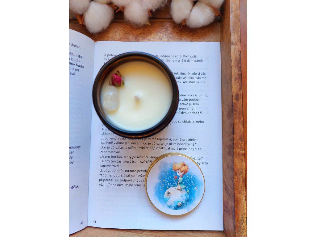 Přírodní svíčka „Správně vidíme jen srdcem“ vznikla jako voňavý doprovod pro chvíle, kdy potřebujeme blízkost, laskavost nebo připomínku, že to nejdůležitější je skryté očím. Inspirací byl Malý Princ a jeho jemný, poetický pohled na svět. Vůně kombinuje ylang-ylang, bergamot a badyán, které společně vytvářejí atmosféru radosti, fantazie a vnitřního tepla. Každá svíčka obsahuje krátký citát/zprávu, které podpoří její záměr. Minimalistický bílý design doplňuje růže a křišťál, zatímco barevný obal nese motivy Malého Prince.
