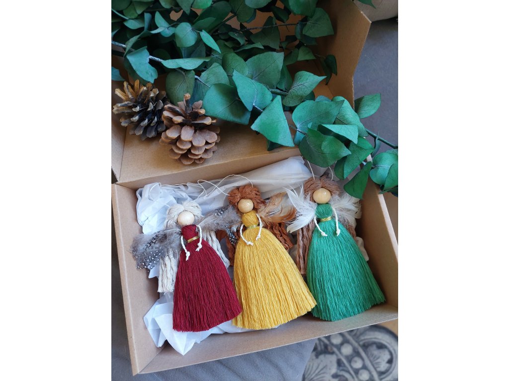 Sada malých andělek vznikla jako jemná ruční dekorace s důrazem na jednoduchost, přírodní materiály a nadčasový vzhled. Každá andělka měří přibližně 10 cm, má jiný účes a je doplněna křídly z peříček v přírodních odstínech. Minimalistické provedení umožňuje andělkám snadno zapadnout jak do přírodních, tak i do bohatě zdobených interiérů. Součástí je nitka na zavěšení a papírová krabička, ve které jsou andělky pečlivě zabaleny.