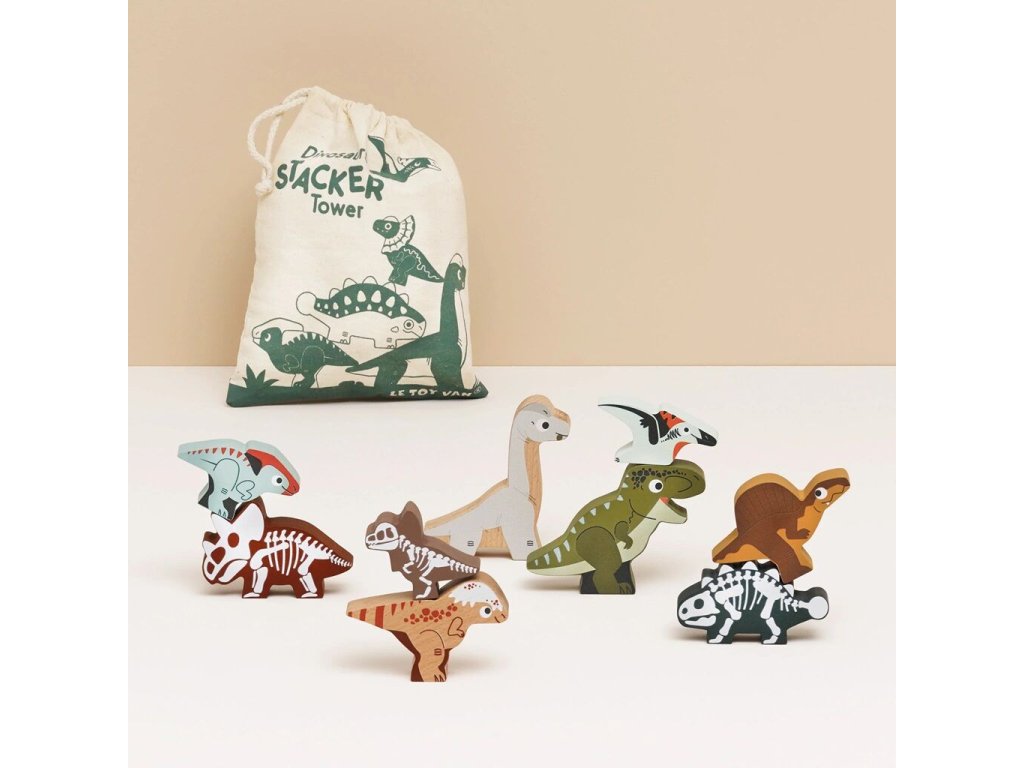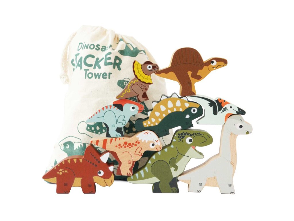 Skládací věž Dinosauři obsahuje 9 dřevěných figurek, které lze skládat na sebe, stavět do výšky nebo rozložit vedle sebe. Každý dinosaurus má z každé strany jiný motiv – děti tak mohou objevovat nejen jejich vzhled, ale i podobu kostry. Hra podporuje jemnou motoriku, rovnováhu, fantazii i zvídavost. Součástí balení je také praktická plátěná taška, která usnadňuje ukládání i přenášení figurek.