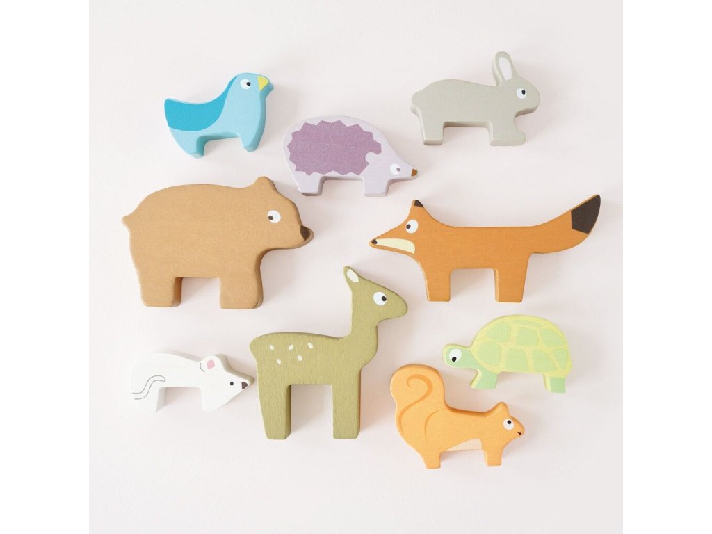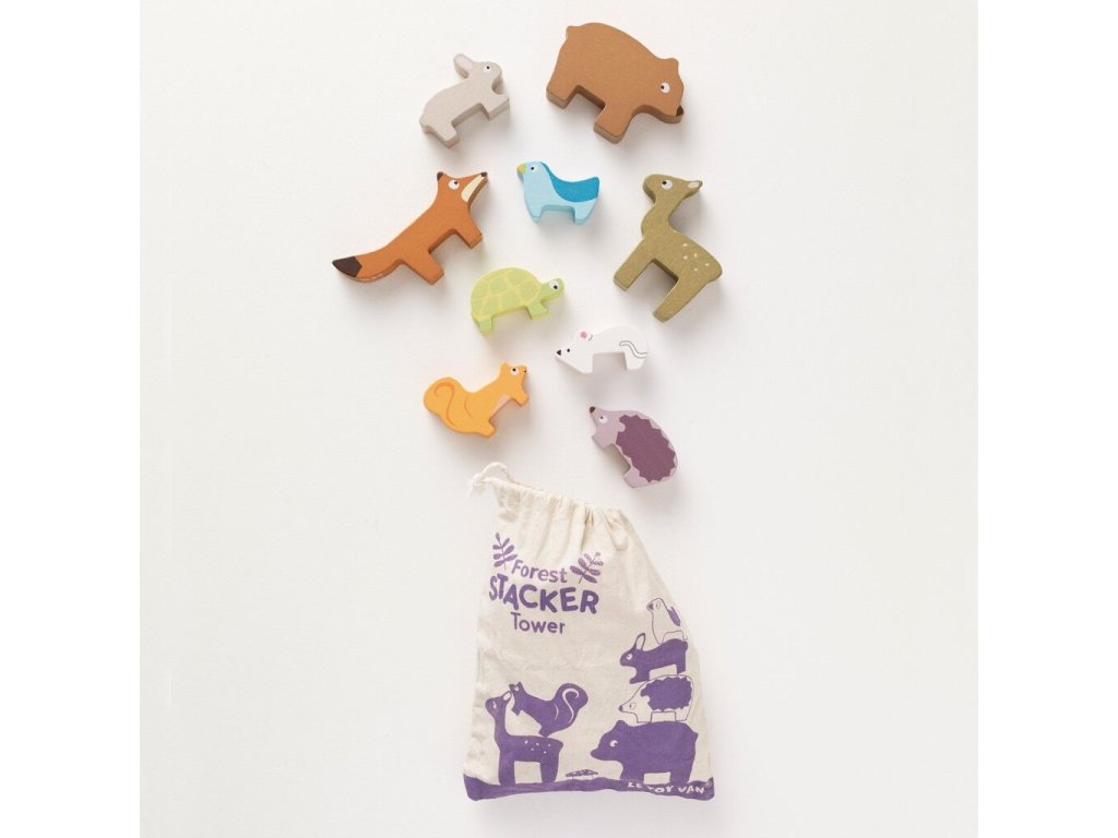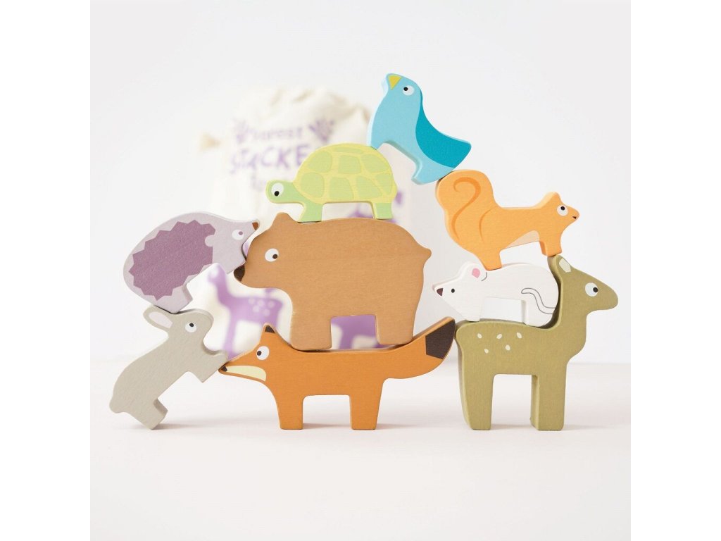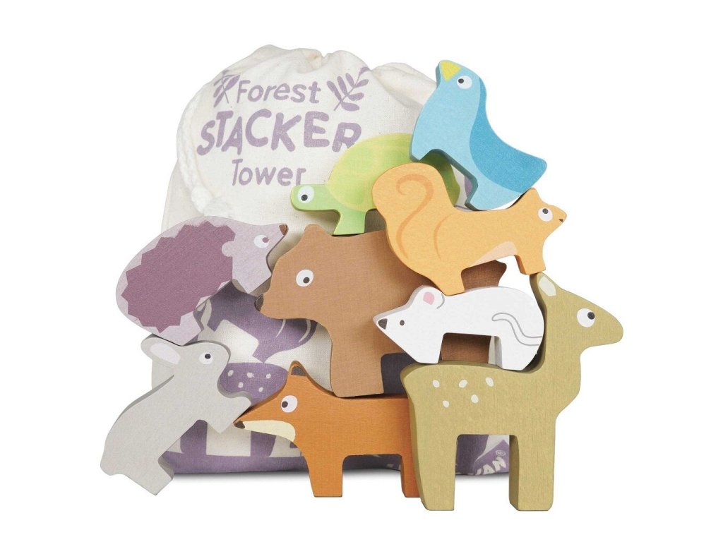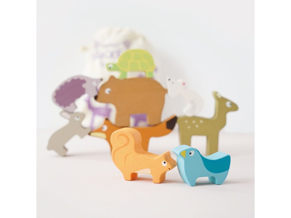 Skládací věž lesních zvířátek je navržena pro nejmenší děti jako hravý nástroj pro rozvoj zručnosti a trpělivosti. Úkolem dítěte je skládat jednotlivé figurky zvířat na sebe a postavit co nejvyšší věž, která se může kdykoliv zřítit. Dřevěné dílky jsou velikostně přizpůsobené dětským rukám a umožňují bezpečnou manipulaci. V sadě se nachází liška, zajíc, ježek, medvěd, myš, želva, veverka, koloušek a ptáček. Hračka přirozeně podporuje rozvoj jemné motoriky, koordinace ruka-oko i kognitivních dovedností a zároveň dětem hravou formou přibližuje svět přírody. Vyrobena z vysoce kvalitního FSC dřeva z udržitelných zdrojů, ručně domalována ekologickými barvami na bázi vody. Součástí balení je bavlněný pytlík, díky kterému je hračka ideální i na cesty.