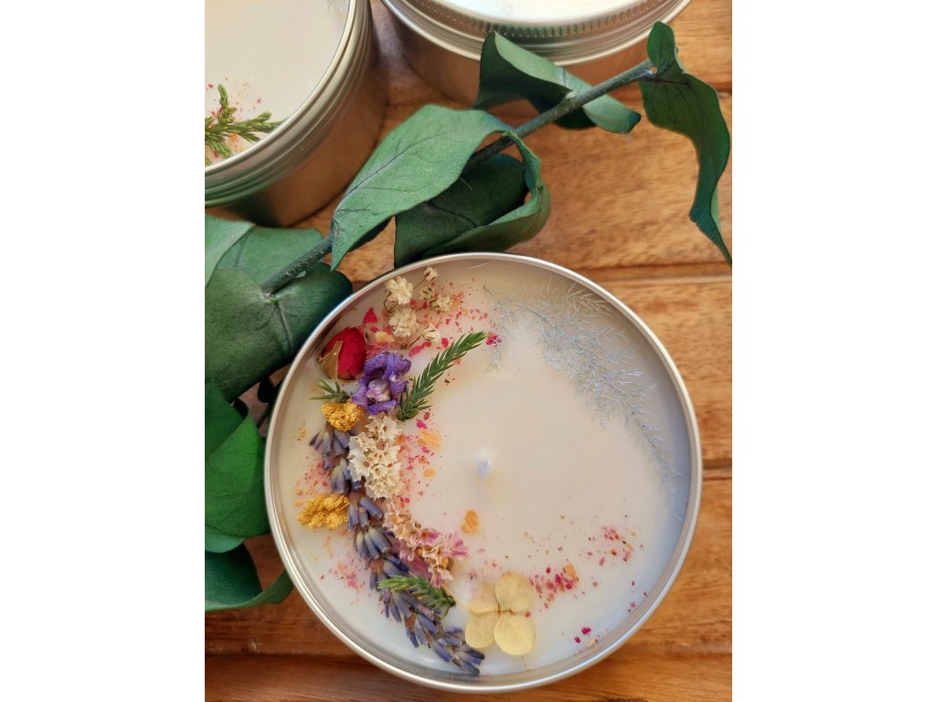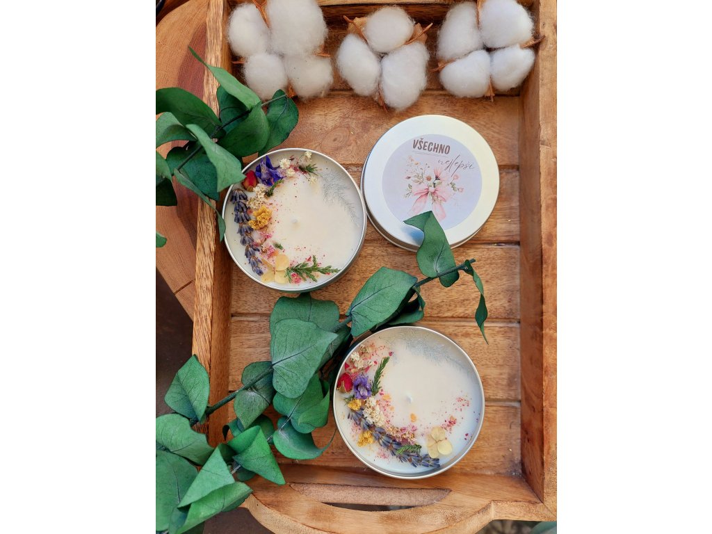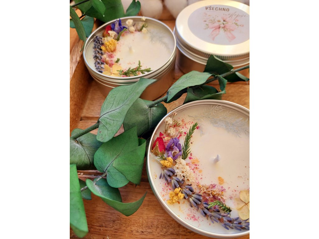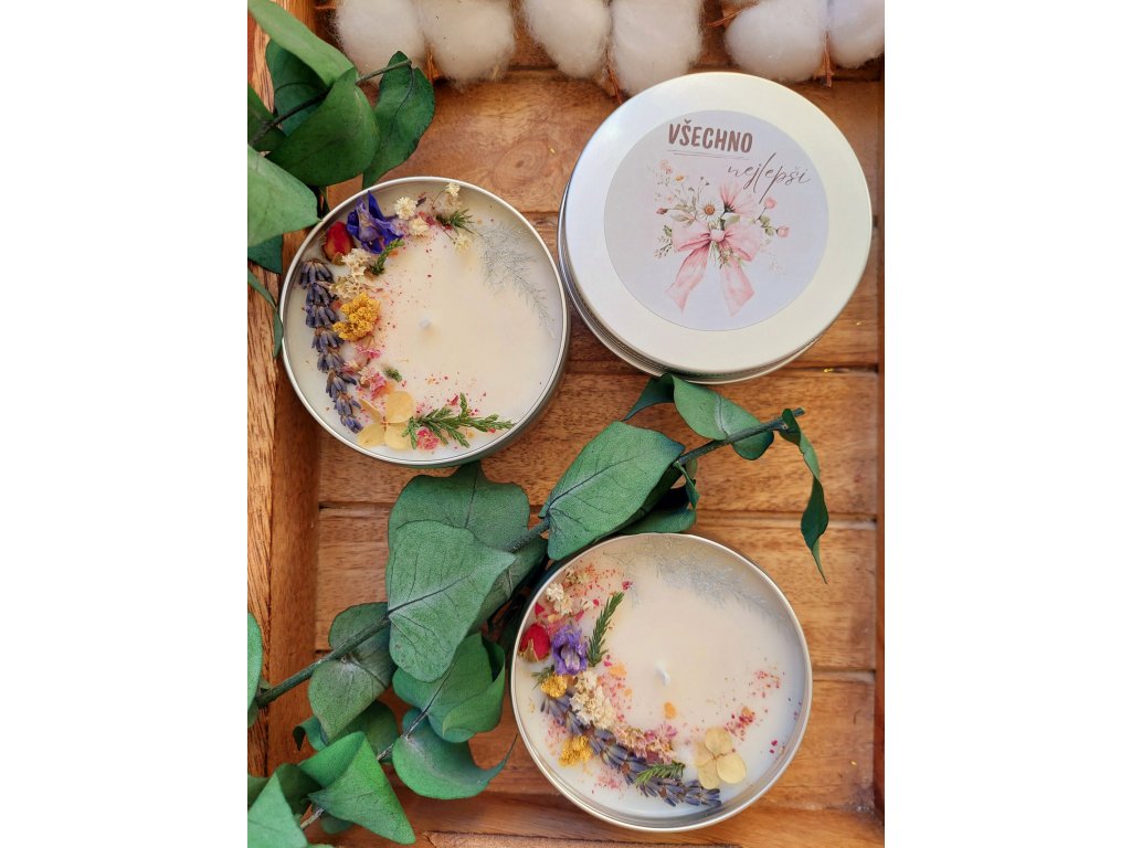 Ručně vyráběná sójová svíčka VŠECHNO NEJLEPŠÍ je ideálním dárkem pro výjimečné příležitosti. Je uložená ve stříbrné hliníkové dóze a zdobená bohatou směsí květin, kvítků, bylin, okvětních plátků, lístků a přírodních dekorací. Použitý sójový vosk je šetrný ke zdraví, nečoudí, neuvolňuje škodliviny a hoří déle než běžné parafínové svíčky. Každá svíčka je díky ručnímu zdobení barevně jedinečná.