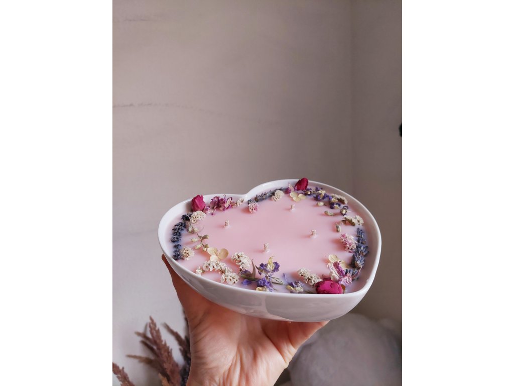 Valentýnská svíčka v bílém poracelánovém srdíčku je výjimečným spojením přírodních materiálů, jemné aromaterapie a romantického designu. Svíčka je zasazena do bílého porcelánového srdíčka o rozměrech 18,5 × 18,5 × 5 cm a zdobená přírodními květinami. Každé květinové aranžmá je originální, vždy však laděné do stejného jemného stylu. Vosk má světle růžový odstín, nebo může být i čistě bílý.