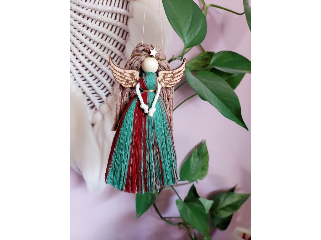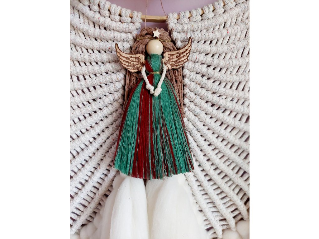 Andělka „MÍNA“ je něžná vánoční dekorace, která spojuje tradiční barvy — zelenou a červenou — s jemností ruční tvorby.