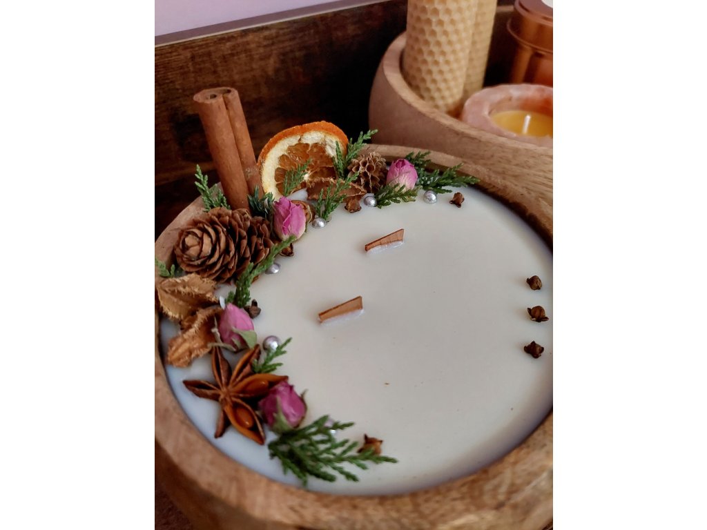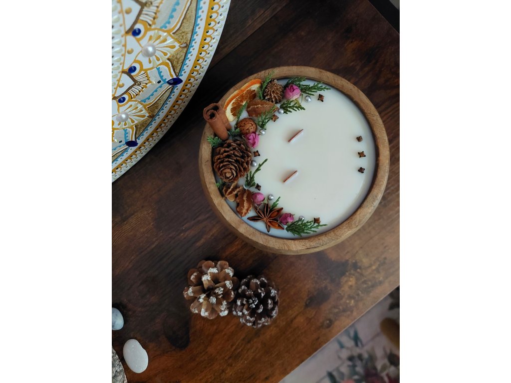 Svíčka je zdobena přírodními materiály: sušenými plody, jehličím, kořením, květinami a drobnými zimními dekoracemi. Každý kus je ručně tvořený originál.
