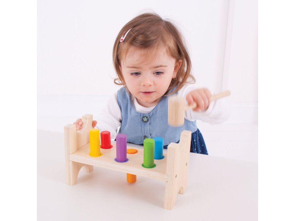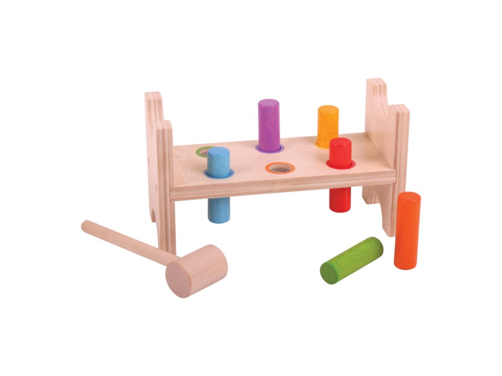Tato dřevěná zatloukačka nabízí dětem jednoduchou, ale velmi zábavnou aktivitu. Klepnutím na pestrobarevné dřevěné kolíky v otvorech směrem dolů vytvoří děti plochý pracovní stůl, poté stačí hračku otočit a hra začíná znovu. Součástí balení je robustní dřevěné kladívko a celá hračka má mírně zakřivené hrany pro bezpečné používání. Při hraní děti přirozeně rozvíjejí jemnou motoriku, obratnost a koordinaci ruka–oko. Vyrobeno z kvalitních, odpovědně získaných materiálů a splňuje evropské bezpečnostní normy.